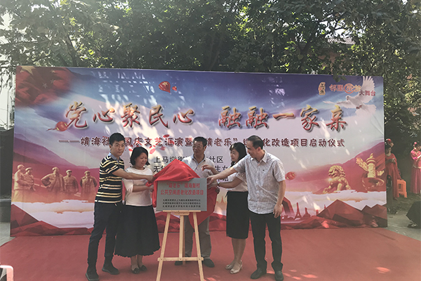 启动仪式上,靖海街道党总支书记沈莉首先对社区基本情况和“靖老乐”适老化改造项目进行了介绍,对参与和谐社区建设和“靖老乐”项目的社会各方表示了衷心的感谢。紧接着,外语与旅游学院党总支书记江铭代表外语与旅游学院发言,他对项目正式启动表示了热烈的祝贺,对我院志愿者在项目前期所做的工作和努力表示了肯定;同时表示今后我院师生志愿者们还会一如既往的支持和参与社区志愿服务和公益活动,在实践中了解国情民情,实现个人成长与社会需求的统一。随后,无锡市上马墩街道办事处副主任华红杰、靖海街道党总支书记沈莉、无锡市新吴区落花生女性公益促进组织中心理事长陈华、无锡广电“益联盟”项目公益代言人马龙、外语与旅游学院党总支书记江铭5位嘉宾共同为“靖老乐”适老化改造项目进行了揭牌。最后,由芬芳艺术团和我院志愿者们共同为社区居民带来形式多样、精彩纷呈的文艺汇演。