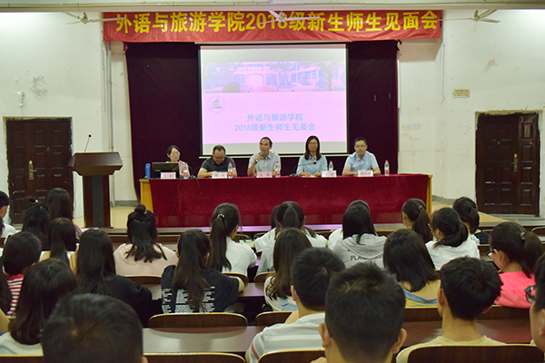 在这丹桂飘香,阳光灿烂的金秋时节,外语与旅游学院迎来了2018级新生。9月10日上午9点整,外语与旅游学院在中桥校区实验楼阶梯教室召开2018级新生师生见面会,外语与旅游学院党总支书记江铭,院长杨丽、副院长梁峰、院长助理徐优明、各专业辅导员、班主任,以及全体2018级新生参加了此次见面会。