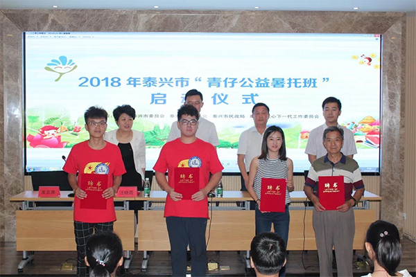 7月18日上午,泰兴团市委在姚王镇创业富民中心举办了“2018年青仔公益暑托班”启动仪式,仪式上一群“小红人”从团市委领导手中接过了大红聘书,成为姚王镇公益暑托班的老师。他们就是我校“蒲公英”支教联盟泰兴分队的志愿者们,这个暑假他们将陪伴这里的留守儿童一起度过。