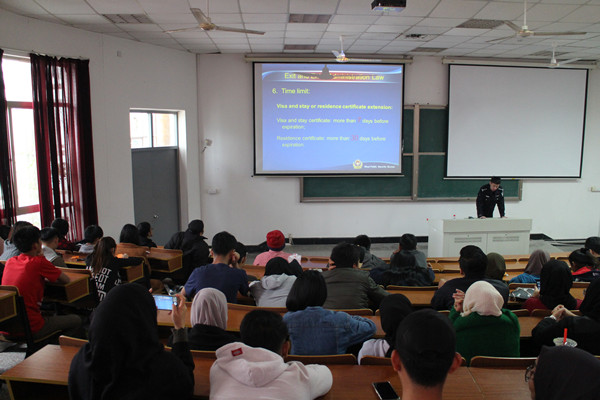 为进一步加强我校外国留学生的法律法规与安全教育,提高留学生的法律安全意识。近日,国际教育学院邀请无锡市出入境管理局的葛晓晖、李星諓警官为留学生们作了“外国留学生法律法规与安全教育”的专题讲座,全体留学生和部分教学及管理人员参加了培训。