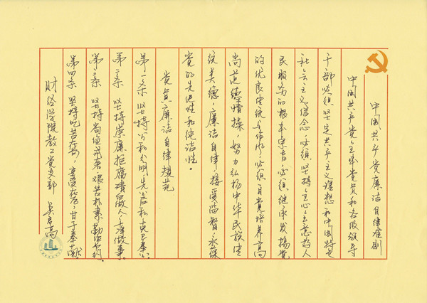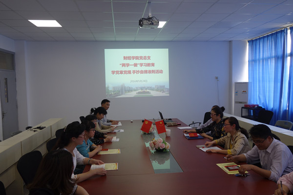 围绕“两学一做”学习教育内容,结合校办监察处布置的廉洁文化活动安排,财经学院党支部于5月24日在J2-408组织开展了“学党章党规 手抄自律准则”活动,并观看了警示教育片。