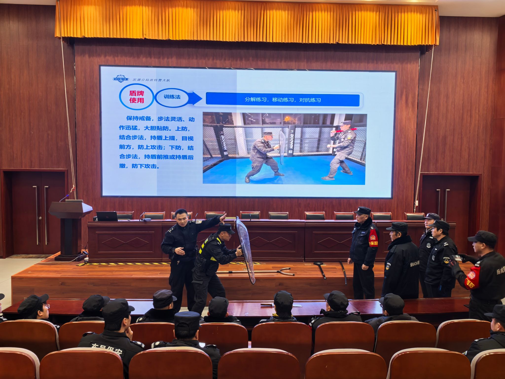 随后,数名巡特警队员接棒上阵,不仅详细解析了盾牌、钢叉、头盔等校园安保“八大件”的正确使用方法,还通过分组实操、模拟对抗等形式,让保安人员亲身体验了应急处突、防恐防暴的实战场景,确保每位参训者都能熟练掌握并灵活运用所学技能,有效提升应对突发事件的实战能力。