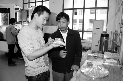 “90后”学长在给谭伶(右)讲解模具相关知识