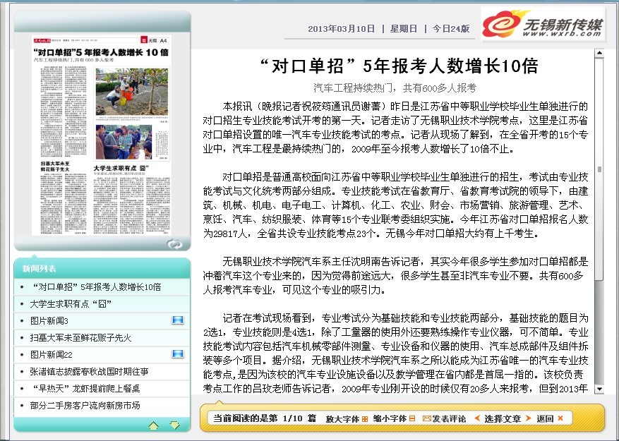 本报讯(晚报记者 祝晓筠 通讯员 谢菁)昨日是江苏省中等职业学校毕业生单独进行的对口招生专业技能考试开考的第一天。记者走访了开云体育·开云官方网站考点,这里是江苏省对口单招设置的唯一汽车专业技能考试的考点。记者从现场了解到,在全省开考的15个专业中,汽车工程是最持续热门的,2009年至今报考人数增长了10倍不止。