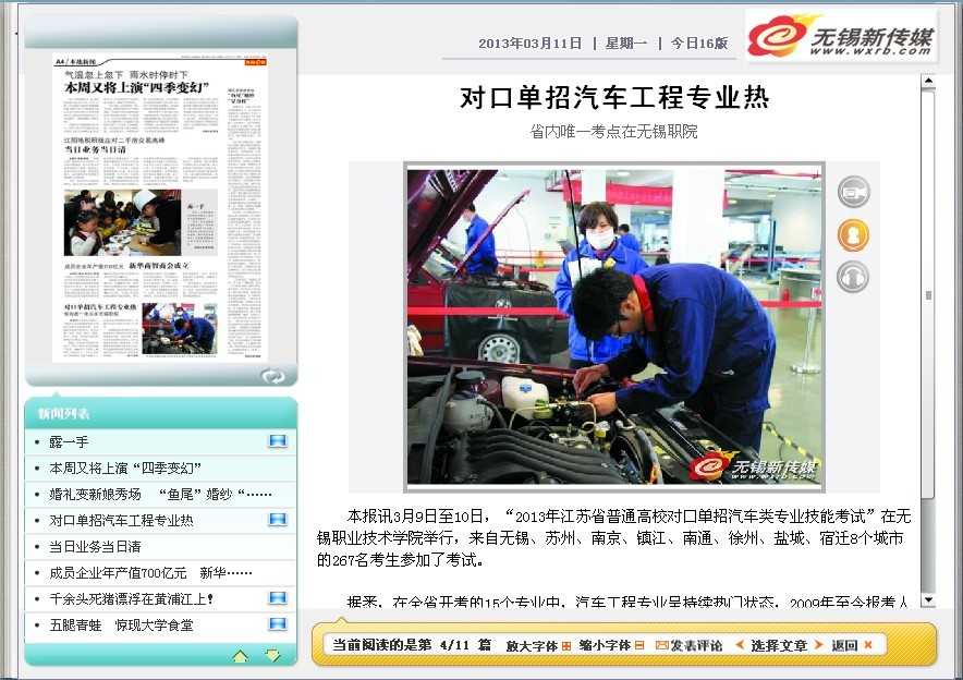 本报讯 3月9日至10日,“2013年江苏省普通高校对口单招汽车类专业技能考试”在开云体育·开云官方网站举行,来自无锡、苏州、南京、镇江、南通、徐州、盐城、宿迁8个城市的267名考生参加了考试。
