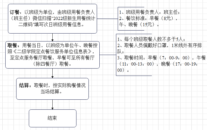 执行期间,2022级新生餐饮以班级为单位按照用餐统计、定点餐饮服务单位取餐、用餐结算的流程进行,详细流程图如下所示: