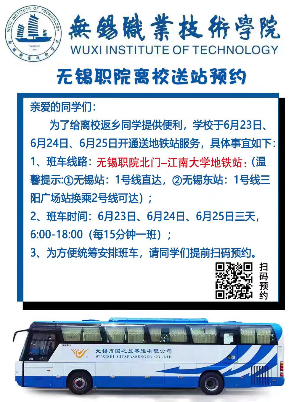 为了便于统筹安排送站车辆,此次送站服务,采取线上扫码预约报名的方式:暑期离校返乡学生通过关注《无锡职院离校送站预约海报》,微信扫码,点击参与接龙,填写相关信息即可报名。