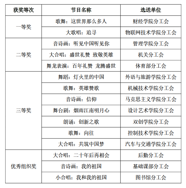 第六届“魅力职院”迎新年文艺联欢会已于12月28日圆满落幕,经现场打分评审,现将教职工组一、二、三等奖及优秀组织奖获奖节目名单公布如下:
