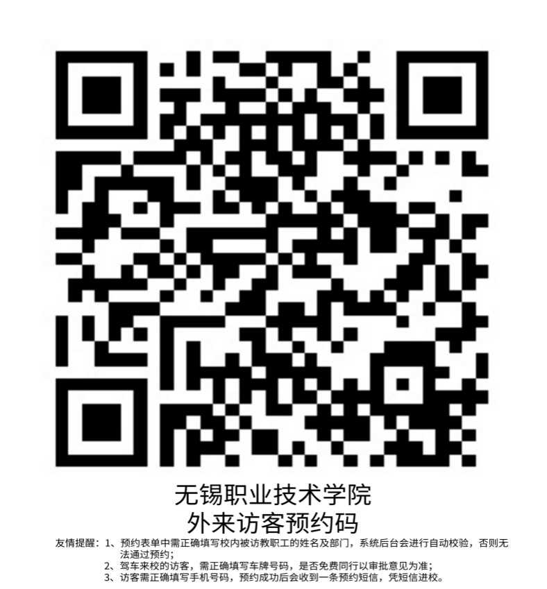 访客通过微信扫描下方“外来访客预约码”后,按实填写“疫情期间外来访客预约进校登记表(访客自助版)”,选择“拜访部门”,填写“拜访人员姓名”并上传“锡康码”或“苏康码”截图,若驾车来访请正确填写机动车牌号,申请预约成功并通过审核后,进校时该车牌自动识别为“预约车”。表单填写完毕后点击“提交”,经拜访人员审核通过拜访部门领导审批同意,保卫处备案后自动生效。