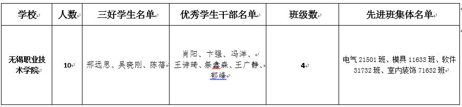 2018年江苏省三好学生、优秀学生干部、先进班集体的评定工作现已结束,经学生申报、分院初审、学校复审,拟推荐邢远思等10名学生获评“省级三好学生”或“省级优秀学生干部”的荣誉称号,电气21501班等四个班级获评“省级先进班集体”的荣誉称号。现将名单公示如下,如有异议,请在五个工作日内向学生处或监察处反映,联系电话:8840、8837。